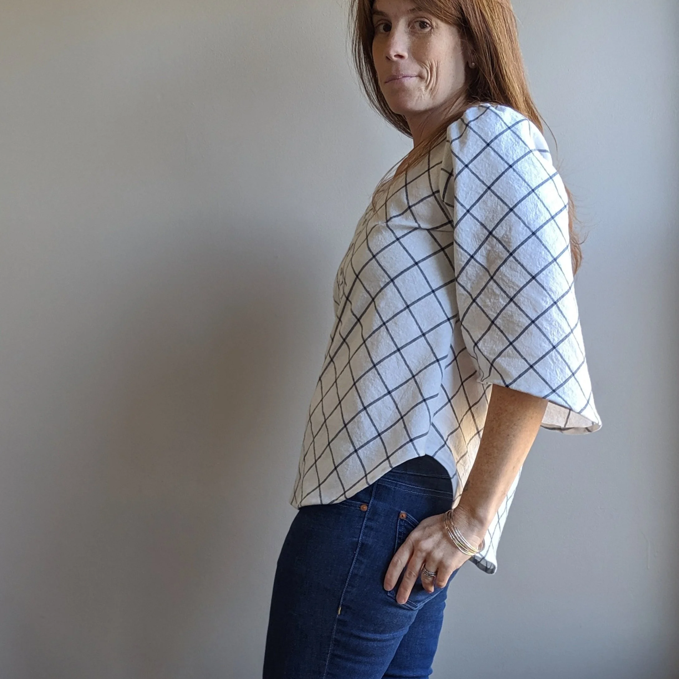 So, I’m proud to say this windowpane Essex (purchased from Raspberry Creek Fabrics) only aged a year in my stash before I figured out what to pair it with: Hey June Handmade’s Lucerne. I tested Lucerne earlier this year and have sewn it several times since.