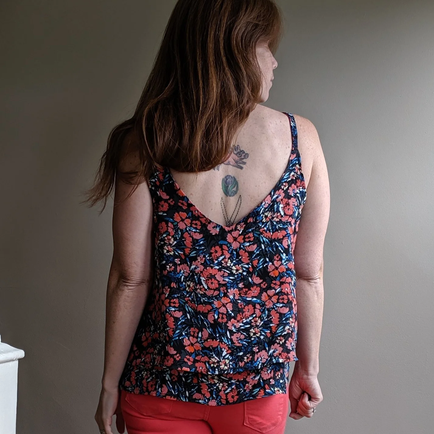 For my first tiered cami, I used only the front and back pattern pieces. I cut 1 set full length and another set shortened 2.5”. (I shortened at the lengthen/shorten line so the tiers would have some movement between them. If you shorten from the hem, the layers will be same widths and sit very closely to each other. ) The full length set becomes the “facing.” Just be sure to sew the right side of the shortened/outer set to the wrong side of the “facing”/longer set. I did this exactly backwards (with the shortened layer ending up inside the full length) on my first go, because braining is hardest sometimes for the simplest of tasks.